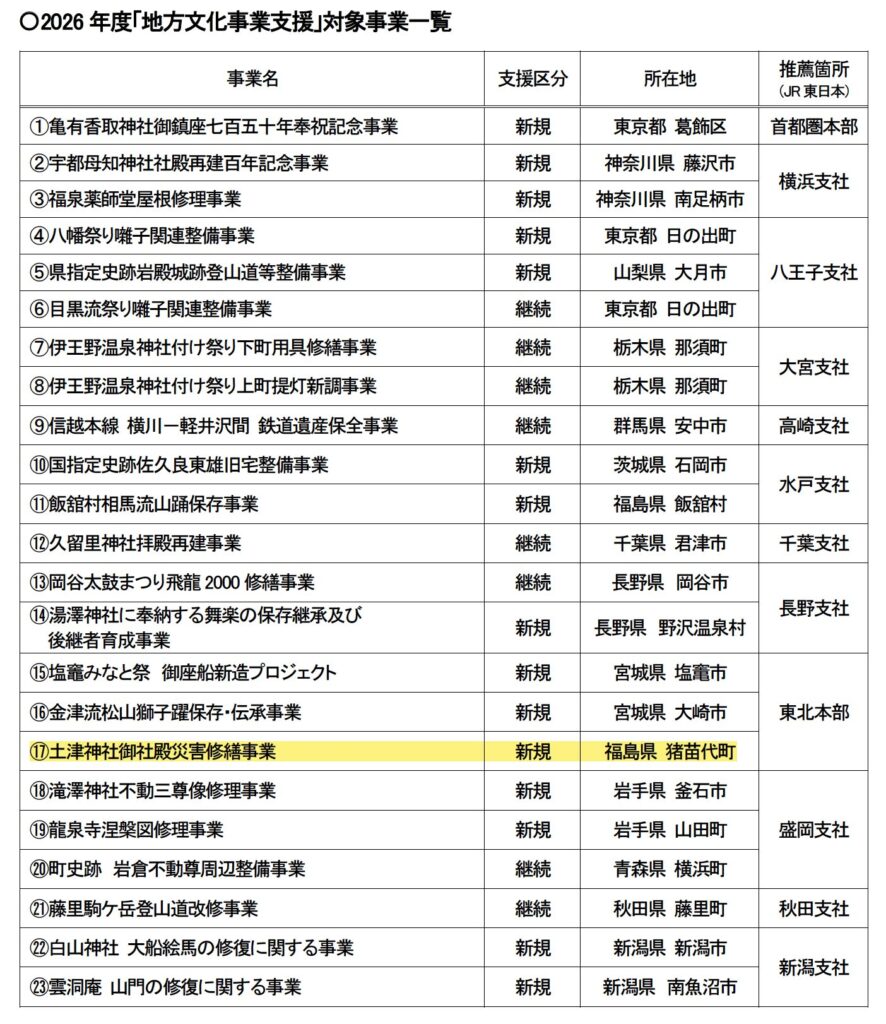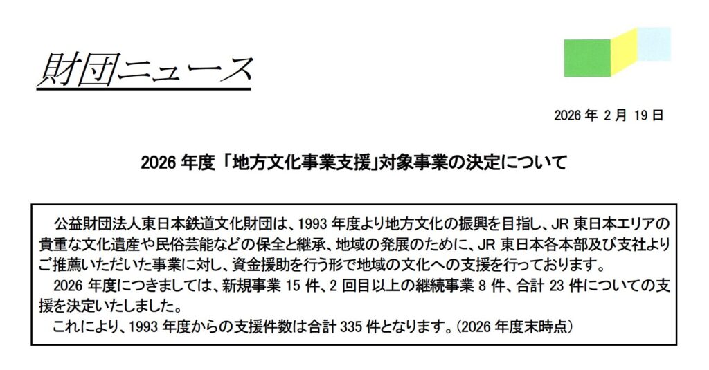 東日本鉄道文化財団「2026年度地方文化事業支援」採択のご報告